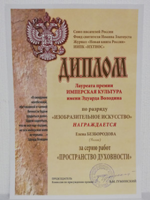 По итогам 2022 года в номинации «Изобразительное искусство» премия присуждена скульптору Елене Безбородовой за серию работ "Пространство духовности".